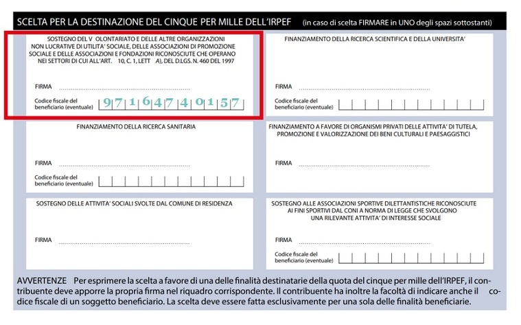 Se vuoi sostenerci anche con questo gesto prezioso, individua il riquadro “Sostegno degli enti del terzo settore iscritti al RUNTS”, scrivi il CF 97164740157 e poni la tua firma.