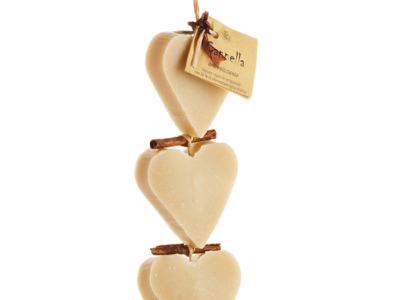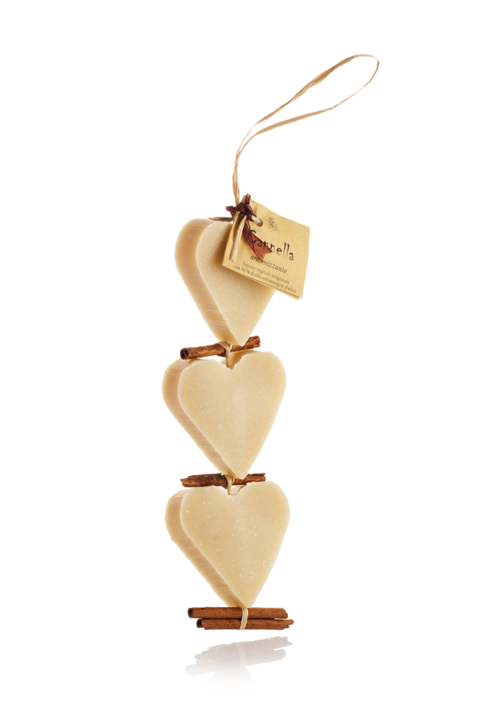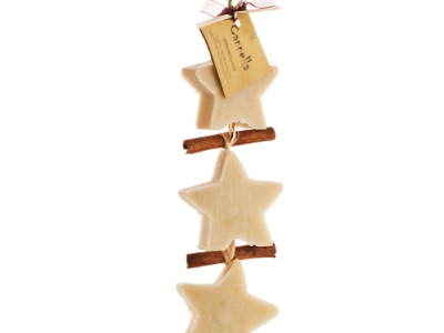 Forme di sapone alla cannella confezionate con bastoncini di cannella e raffia