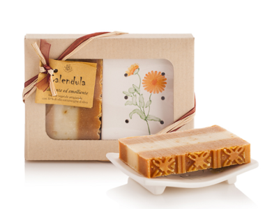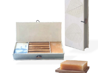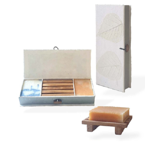 Scatola con Portasapone di legno piccolo e 2 saponette 50g